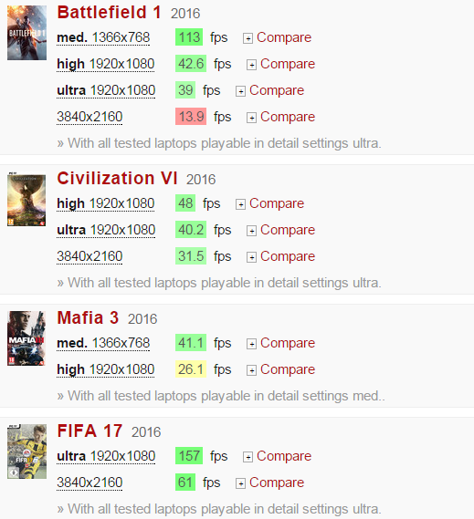 Kinerja GeForce GTX 1050 dapat cukup bervariasi tergantung pada kinerja pendinginan laptop. Ia bisa sama cepat dengan model desktop di bawah kondisi ideal, tetapi model notebook biasanya sedikit lebih lambat. GeForce GTX 960m mampu dilewati sekitar 30%, sehingga GTX 1050 sebanding dengan GTX 965M pada umumnya. Oleh karena itu anda bisa memainkan Game dari 2016 dalam pengaturan medium hingga High pada resolusi Full HD.