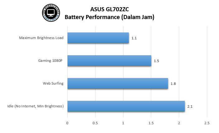 Dan hal tersebut berimbas pada kinerja baterai. Anda tidak akan melihat waktu yang cukup lama pada laptop ini, meskipun dalam keadaan idle. Dengan performa baterai pada saat idle, pilihan laptop ini bisa bertahan hingga 2.1 jam saja, sedangkan untuk gaming, anda akan diberi waktu maksimum hingga 1.5 jam saja sebelum mencolokannya kembali untuk mengisi baterai.