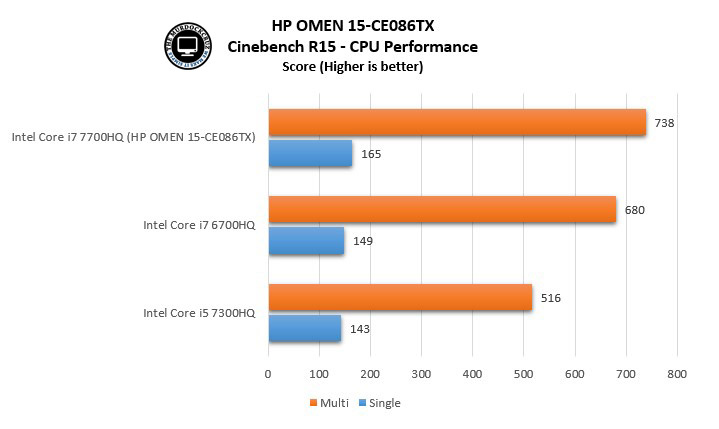 CPU Quad core ini benar-benar bisa diandalkan, bukan saja untuk gaming, namun juga untuk aplikasi yang memerlukan nilai core extra untuk kegiatan multi-thread. Dalam tes yang kami lakukan pada Cinebench, Intel Core i7 7700HQ yang dimiliki laptop ini memiliki nilai tertinggi untuk urusan multi-thread dengan skor 738, jauh melebihi kinerja CPU sebelumnya, yakni 6700HQ.