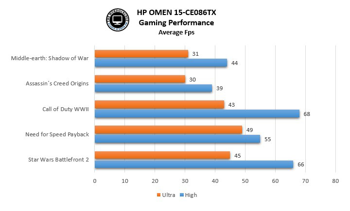 Hal lainnya yang sangat berpengaruh pada ujicoba adalah kinerja gaming. Ini tentu menjadi bagian utama ketika kita akan membeli sebuah laptop gaming. Beberapa tes yang kami hadirkan merupakan pilihan game terbaru yang cukup menuntut. Dengan melihat hasil dibawah ini, tentunya HP OMEN 15-CE086TX mampu memberikan nilai yang handal untuk gaming 1080p pada pengaturan tertinggi. Anda akan memiliki kenyamanan untuk pengalaman gaming ketika laptop tersebut bisa memberikan nilai FPS diatas 40.