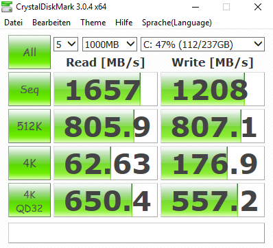 HP OMEN 15-CE086TX membawa pilihan penyimpanan M.2 SSD sebesar 256GB, meskipun beberapa penjual juga menghadirkan pilihan konfigurasi berbeda. Pilihan ini mungkin akan membuat sistem bisa bekerja jauh lebih baik, termasuk untuk urusan booting, mencari data yang lebih cepat apalagi untuk urusan transfer data. Ketika kami mengetes kinerja SSD dengan aplikasi CrystalDiskMark, nyatanya ia mampu memberikan kinerja transfer data yang sangat baik. SSD yang dihadirkan mampu membrikan performa untuk membaca hingga 1.6Gb perdetik, sedangkan untuk menulis mampu memberikan performa hingga 1.2GB/Detik.