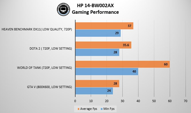 Sedangkan untuk kinerja gaming, HP 14-BW002AX sebenarnya cukup nyaman untuk dilalui pada beberapa gaming eSPort yang populer, namun pengaturan maksimal hanya terbatas pada resolusi 720p medium setting. Contohnya, DOTA 2 tentu akan sangat ideal pada notebook tersebut, hanya saja pengaturan yang dihadirkan lebih terbatas pada low setting dengan nilai Fps diatas 30.