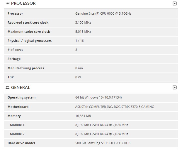 Menurut situs Techspot, informasi tentang benchmark dari 3DMark bisa sepenuhnya dipercaya, karena tolok ukur kinerjanya ditampilkan kepada khalayak umum, dan dapat diakses setiap saat. Meskipun, entri database daftar prosesor masih “tidak diakui”, spesifikasi menunjukkan bahwa ini adalah bagian dari Core i9-9900K dengan kekuatan 8 core, 16 thread, dan maksimum Turbo hingga 5GHz. Ini juga diharapkan datang dengan 16 MB L3 cache, TDP 95W, dan chip grafis Intel UHD 620.