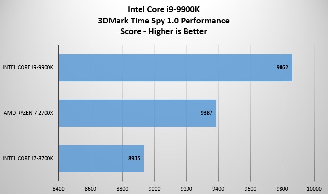 Dalam uji Spy Time 3DMark, skor CPU yang dihasilkan oleh prosesor Intel Core i9-9900K adalah 10719 dan 9862 secara keseluruhan. Ini mampu dicapai dengan menggunakan motherboard Asus ROG Strix Z370-F Strix Gaming dengan memori 16GB G.Skill DDR4-2666, SSD Samsung 960 Evo 500GB, dan kartu grafis GeForce GTX 1080 Ti. Ini juga bisa menunjukkan gambaran baru bahwa seri terbaru Intel generasi ke-9 masih kompatibel dengan mobo Z370, hanya saja pengguna pastinya perlu mengupdate BIOS. Selain itu, kehadiran chipset Z390 yang akan datang bisa menjadi pilihan utama bagi pengguna jika dibandingkan dengan seri Z370 (sebagai pilihan alternatif) atau juga bisa dikatakan sebagai rebrand dari seri ini.