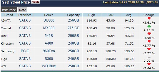 Dan tampaknya tren penurunan harga SSD akan berlanjut hingga penghujung tahun ini. Analis memperkirakan bahwa kelebihan pasokan akan menghasilkan penurunan 10 persen dalam harga jual rata-rata selama kuartal ketiga dan keempat tahun 2018, yang secara tradisional adalah waktu harga puncak. DRAMeXchange mengatakan lemahnya permintaan untuk Flash NAND juga sebagian diakibatkan oleh menurunnya pasar smartphone, dimana menurut IDC, mereka melihat pengiriman turun 1,8 persen YoY selama kuartal terbaru.
