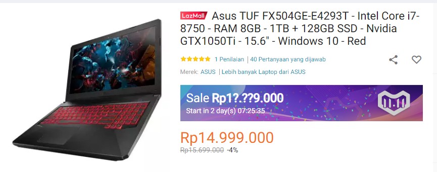 Contoh paling menyenangkan untuk dilirik adalah pilihan laptop gaming sekelas ASUS TUF FX504GE-E4293T yang memiliki kekuatan prosesor Intel Core i7-8750H, Nvidia GTX 1050Ti, RAM sebesar 8GB DDR4, pilihan storage antara SSD 128Gb dan 1TB HDD plus Windows 10 Original, dimana pilihan tersebut biasa disajikan dengan nilai harga diatas 16 jutaan, kini memiliki harga hanya sekitar 14 jutaan saja. Mereka bahkan siap menyajikan pilihan yang jauh lebih murah pada 11.11 2018 ini. Untuk lebih detail mengenai laptop tersebut, kamu bisa melihatnya disini.
