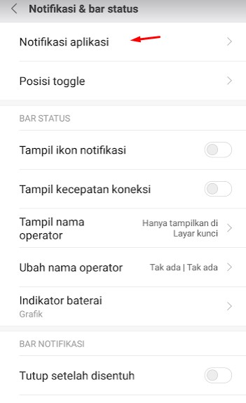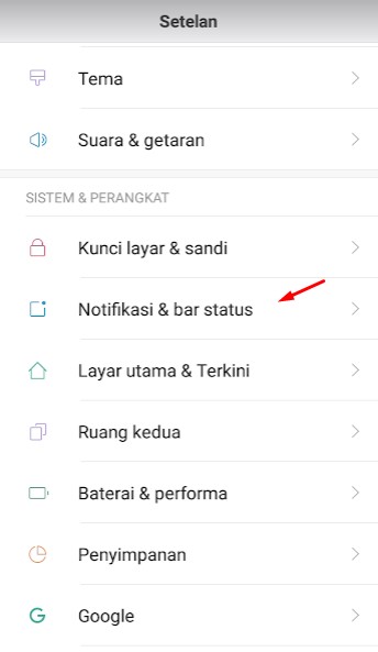 - Kemudian, ketika kamu sudah memasuki Setting, klik pada bagian opsi Notifikasi & Bar Status