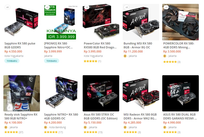 Salah satu contoh nyatanya adalah seri Radeon RX 580 dengan kapasitas 8GB GDDR5 dari MSI maupun berbagai vendor lainnya. Ketika dulu sempat memiliki harga diatas 6 jutaan (bahkan 7 jutaan) saat permintaan sedang tinggi, namun kini hadir dengan sajian harga sekitar 4 jutaan hingga 5 jutaan saja. Kamu bisa melihat daftar lengkap harganya disini.