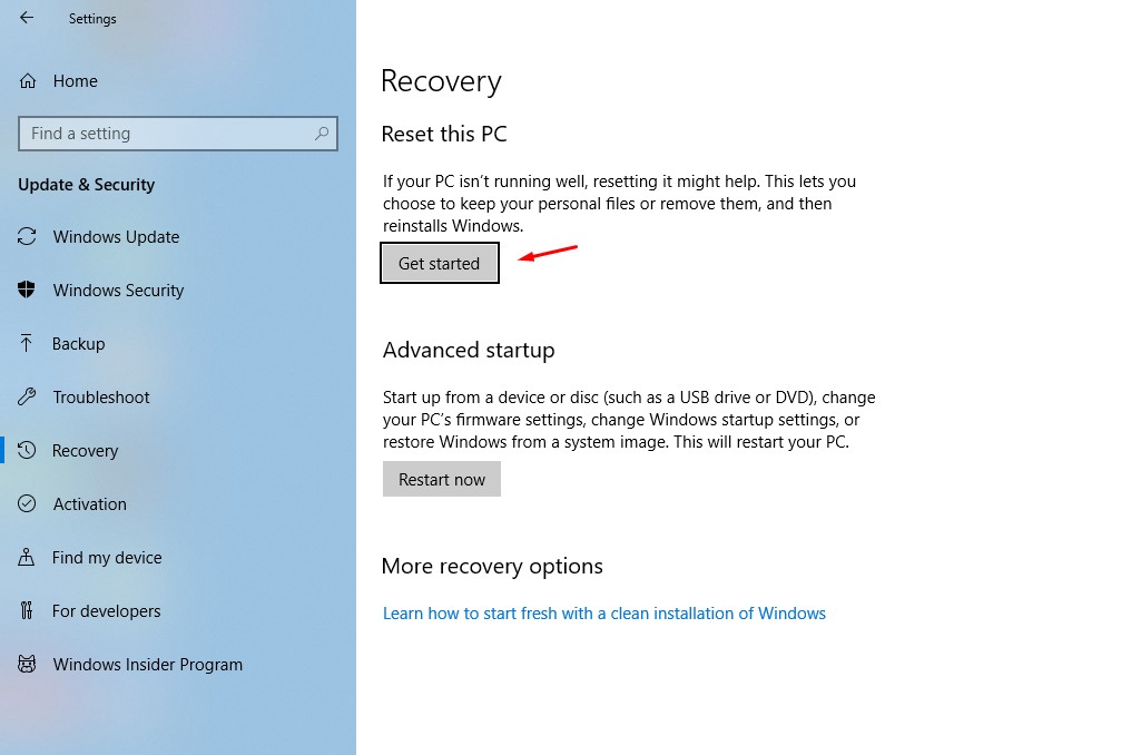 - Kemudian, klik opsi Get Started untuk memulai proses resetting.