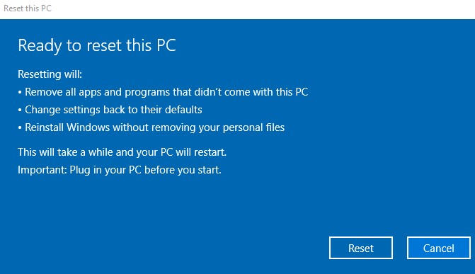 Fitur ini sebelumnya pernah disajikan pada Windows sebelumnya, atau tepatnya pada Windows 8, meskipun tidak selengkap dari apa yang ditawarkan pada Windows 10. Dengan hadirnya fitur Reset This PC pada Windows 10, artinya bahwa sistem akan mengembalikan semua pengaturan awal, sehingga semua file penting pada Windows 10 yang sebelumnya mungkin sudah dimodifikasi akan dikembalikan seperti semula.