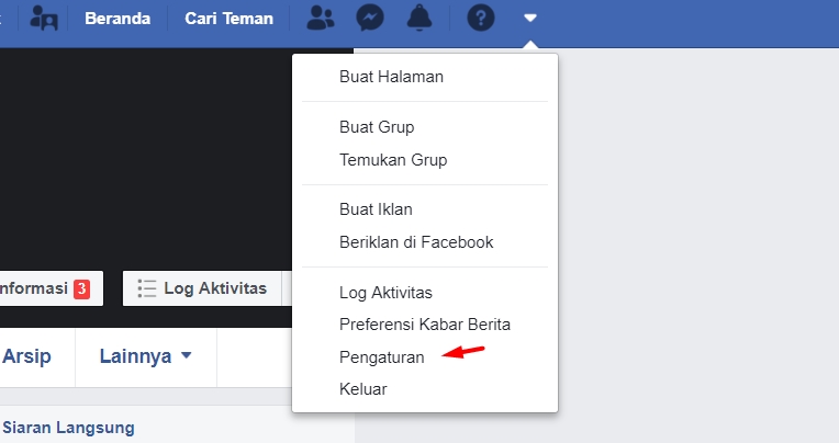 - Langkah pertama, login ke akun Facebook yang ingin kamu hapus, kemudian pergi ke pengaturan di bagian atas kanan yang ditunjukan pada logo kecil segitiga terbalik.