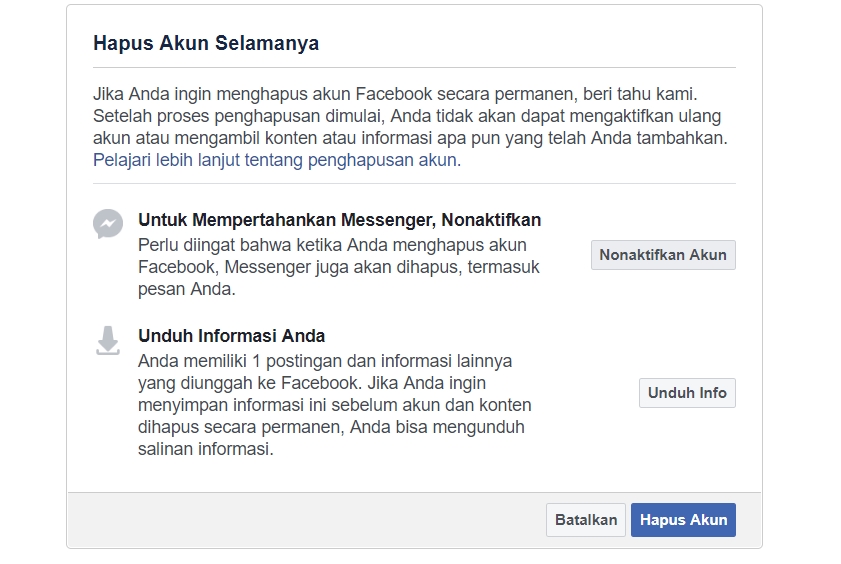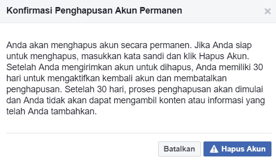 - Pada bagian selanjutnya, pilih opsi Hapus Akun, dimana pihak Facebook akan memulai menghapus akun lama kamu dengan segera, namun kamu masih bisa memulihkan akun tersebut dengan durasi maksimum hingga 30 hari.