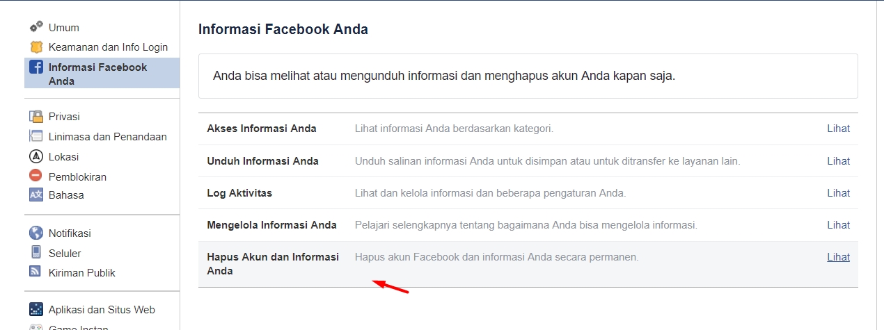 - Setelah kamu masih ke menu pengaturan di Facebook, lihat di bagian Informasi Facebook dan klik opsi Hapus Akun dan Informasi Anda.
