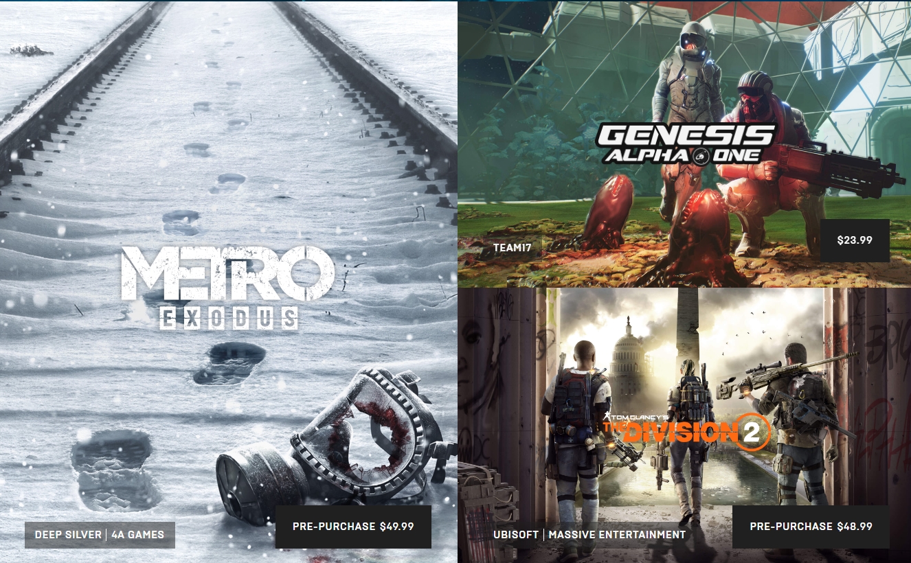 Beberapa game kini sudah tersedia secara eksklusif hadir di platform tersebut, bahkan produsen juga menjanjikan bahwa akan ada lebih banyak game “gratis” yang disediakan oleh pengembang maupun produsen lainnya setiap minggu. Ini tentu akan menjadi salah satu nilai keunggulan yang di bawa oleh Epic, meskipun Steam juga tidak kalah dalam urusan hal tersebut.
