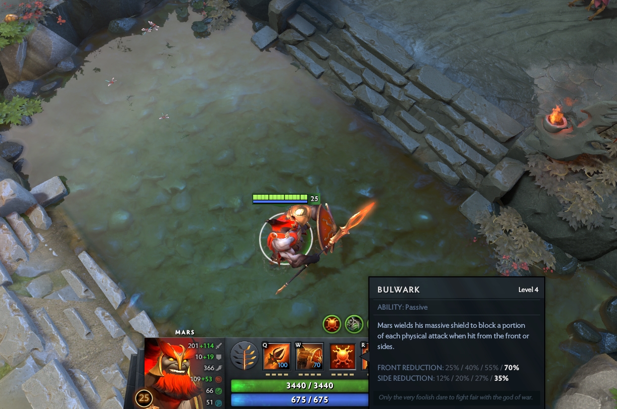 Dan hal terbaik dari Marsh selain skill Arena Of Blood, ia juga memiliki skill pasif yang disebut sebagai Bulkwark. Dengan hadirnya skill pasif ini, Mars bisa menangkis hingga 70% serangan di bagian depan, dan bagian sisi hingga 35%. Jadi, ini bisa menjadi tank yang sangat hebat untuk terus melaju lane hingga titik akhir, meski kamu harus hati-hati dengan seseorang yang akan menyerang karakter tersebut di bagian belakang. Untungnya, Spear Of Marsh juga bisa senjata terbaik untuk melarikan diri.