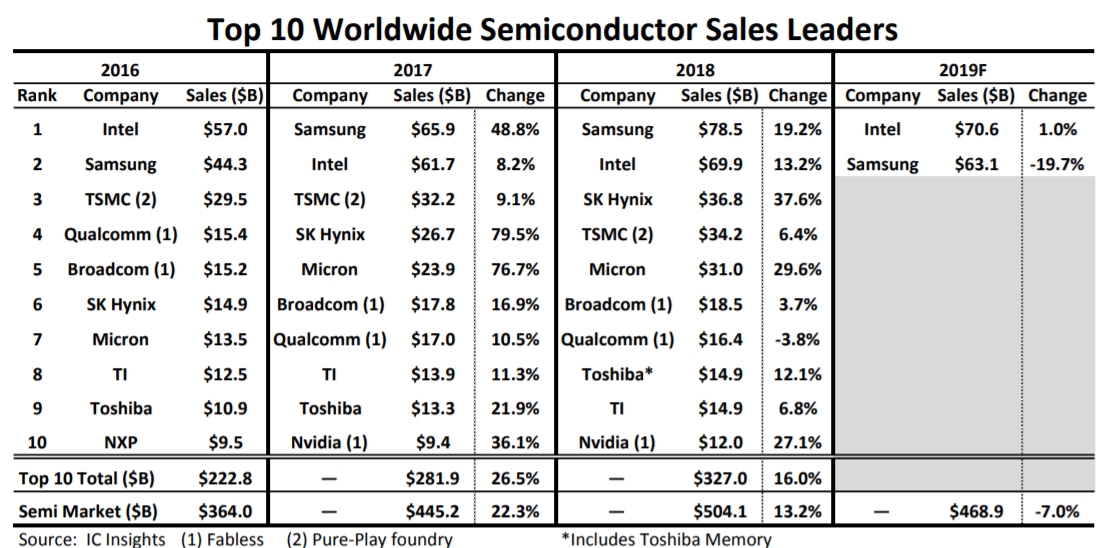 IC Insights menulis bahwa meskipun penjualan semikonduktor Intel diperkirakan akan datar pada tahun 2019 dengan tingkat pertumbuhan hanya 1 persen, namun nilai $ 70,6 miliar masih bisa mengalahkan Samsung dengan hanya prediksi hingga $ 63,1 miliar, yang menandai penurunan 20 persen untuk raksasa teknologi dibandingkan dengan tahun 2018.