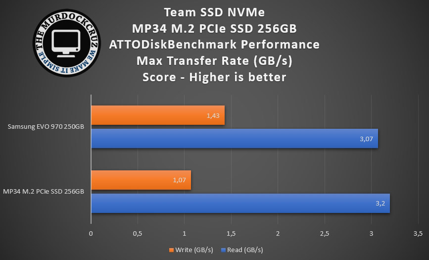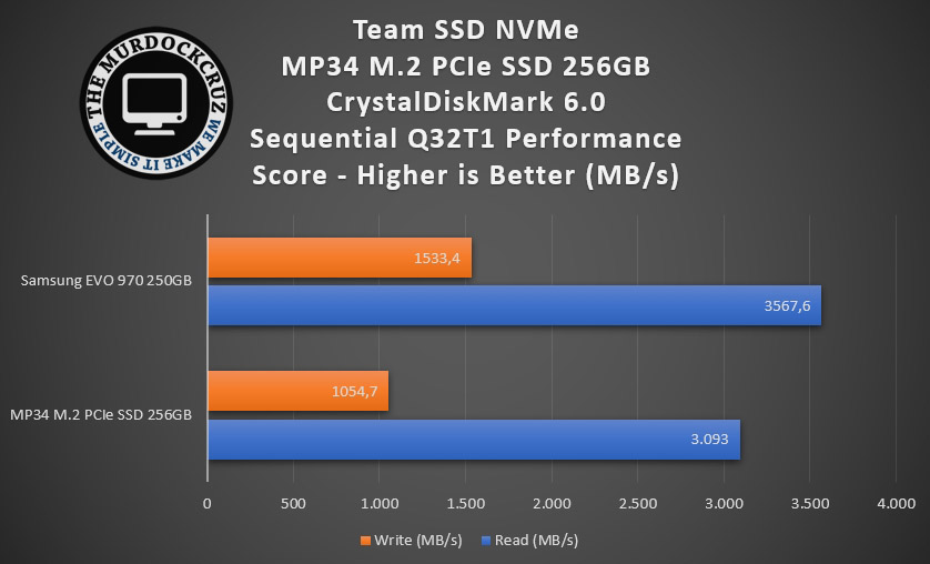 Dalam beberapa tes yang kami lakukan, termasuk pada software Crystaldiskmark 6.0 maupun AttoDisk Benchmark, Samsung EVO 970 mungkin memiliki keunggulan tersendiri, baik dalam performa Read maupun Write, namun MP34 tampaknya memiliki nilai unggulan tersendiri, khususnya ketika berkaitan dengan kinerja Random 4K, terlebih lagi kinerja yang stabil untuk Sequential Read hingga 3093MB/s dan Write hingga 1054MB/s.