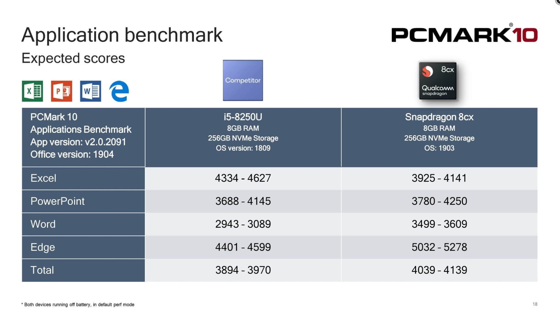 Dan untuk melihat bagaimana performa yang ditawarkan pada prosesor ini, Qualcomm menjalankan 7W Snapdragon 8cx terhadap prosesor mobile Intel 15W Core-i5 8250U melalui 3D Mark dan PCMark. Dalam benchmark aplikasi, 8cx berada di depan dalam lebih banyak tes daripada chip Intel, sementara itu mengalahkan i5 8250U dengan baik dalam benchmark grafis dan uji daya tahan baterai. Namun, patut dicatat bahwa layar 2K digunakan untuk model Intel, sementara desain Qualcomm menggunakan layar FHD, membantu menempatkan Adreno 680 di depan UHD Graphics 620.