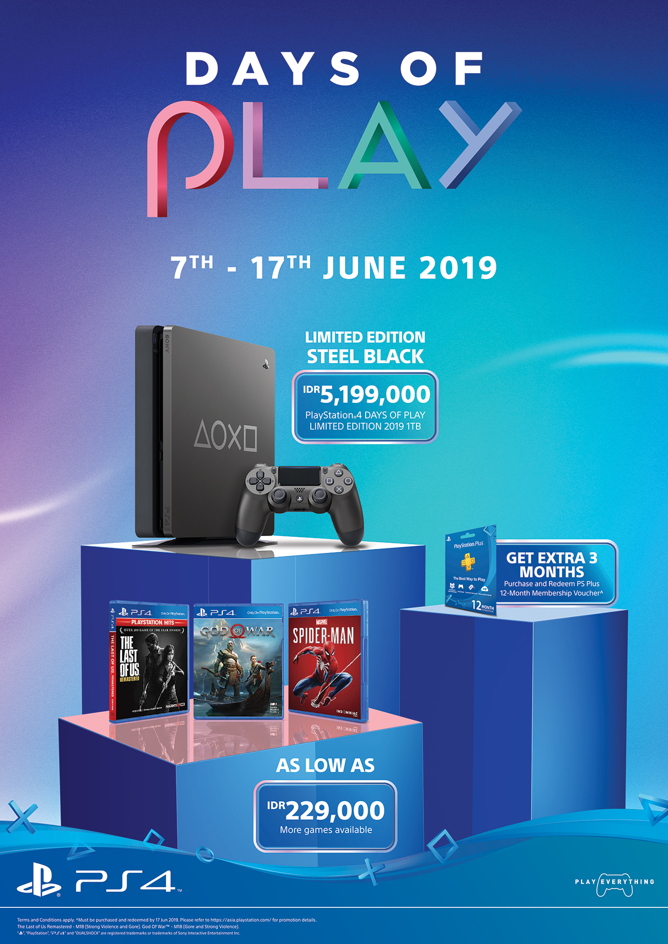 Days of Play tahun ini juga menandai tahun ketiga dari promosi global tahunan, dan penawaran khusus di ritel dan PlayStation Store termasuk judul eksklusif PS4 Days Gone (SIE Worldwide Studios) yang dirilis pada 26 April 2019, Marvel’s Spider-Man, God of War, di samping berbagai kesepakatan lainnya tentang perangkat keras, periferal, judul perangkat lunak, dan layanan jaringan PlayStation.