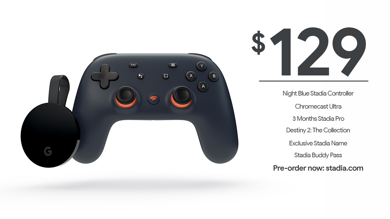 Sedangkan untuk nilai harga $130 Dollar, apa yang akan diterima oleh konsumen adalah paket awal yang disebut sebagai “ Founder Edition” yang berisi tiga bulan layanan Stadia Pro, “Buddy Pass” untuk memberi teman gratis hingga tiga bulan, Destiny 2, Pengontrol eksklusif Night Blue Stadia, Pengendali Stadia Power adaptor, dongle Google Chromecast Ultra, adaptor Google Chromecast Ultra Power dengan port Ethernet, dan nama dan lencana Stadia edisi khusus.