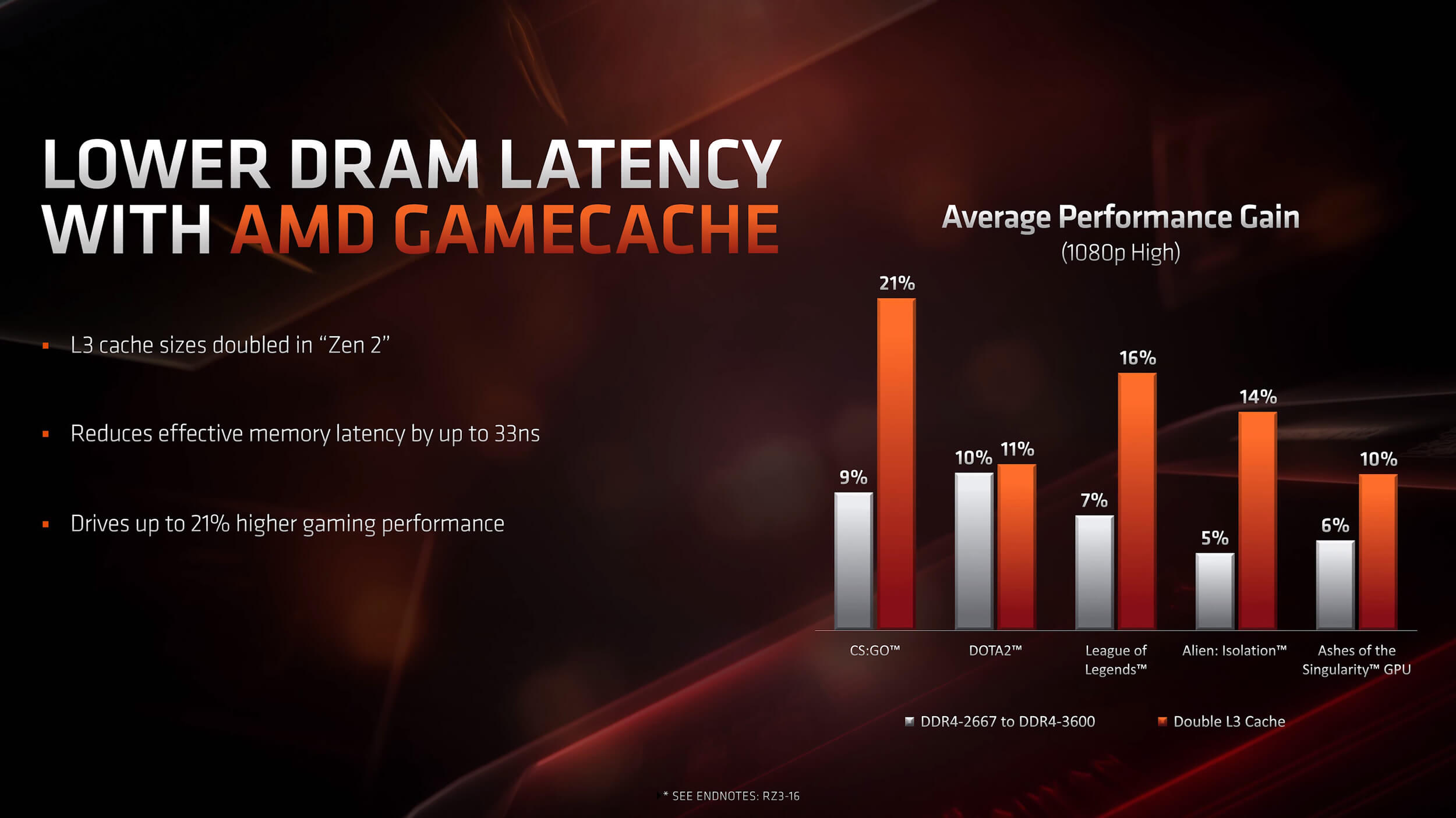 Disisi lain, AMD juga membagikan informasi lebih lanjut tentang Zen 2 dengan nilai inti hadir melalui penggandaan jumlah cache L3 dan latensi memori yang lebih rendah, sehingga pengguna dapat mengharapkan kinerja hingga 21 persen lebih tinggi dalam permainan 1080p.