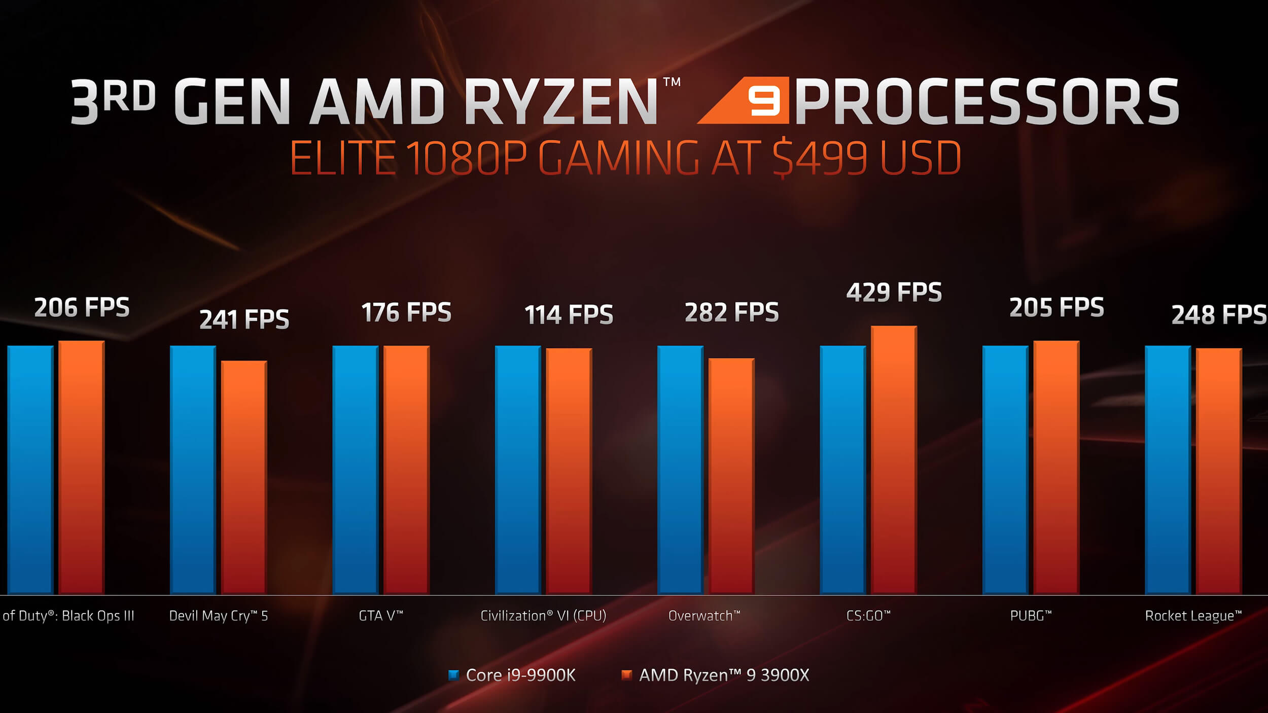 Menurut pengujian AMD sendiri, Ryzen 9 3900X kira-kira setara dengan Intel Core i9-9900K dalam permainan 1080p tetapi unggul dalam tes yang berfokus pada kinerja kreatif seperti Cinebench R20 dan Adobe Premiere. Ini adalah kisah yang serupa dari apa yang bisa ditawarkan oleh Ryzen 7 3800X versus Intel Core i7-9700K dan Ryzen 5 3600X melawan Core i5-9600K, baik dalam game maupun beban kerja kreatif.