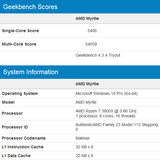 Kebocoran skor tersebut terungkap pada database Geekbench terbaru, dimana hasil yang didapatkan memperoleh skor 34.059, khususnya pada hasil multi-score pada default clockspeed. Pencapaian dari Ryzen 7 3800X mampu mengungguli prosesor Intel Core i9-9900K dengan skor rata-rata hanya mencapai 31.471 (via Anantech) juga pada default clockspeed.