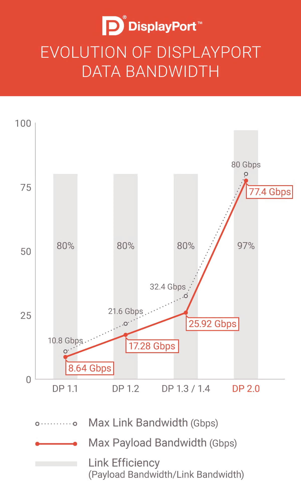 Hal tersebut diungkap oleh Techspot, dimana kehadiran DisplayPort 2.0 akan mampu menawarkan hampir tiga kali lipat bandwidth dari pendahulunya. Generasi DisplayPort 1.4a sebelumnya yang diperkenalkan Asosiasi Standar Elektronik Video (VESA) mampu menawarkan bandwidth 25,9 Gbps. Dan sekarang, standar 2.0, tersebut mampu melompat ke 77,4 Gbps.