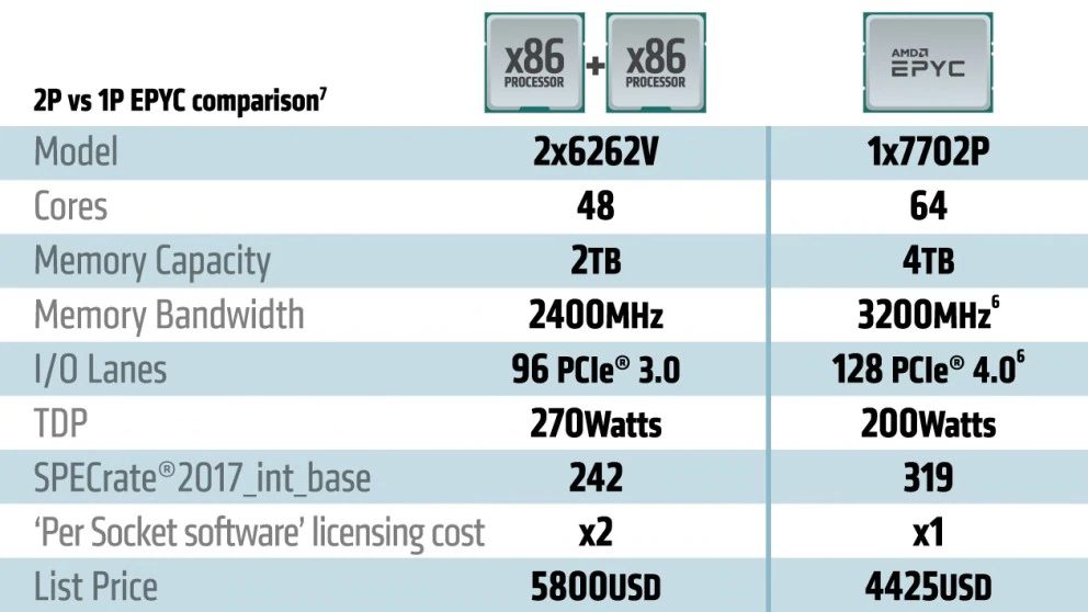 Chip ini juga memiliki fitur keamanan extra, termasuk Secure Memory Encryption, Secure Encrypted Virtualization, dan dukungan hingga 509 tombol, serta mitigasi Specter V2 bawaan. Selain itu, chip tersebut juga mendukung hingga 4TB DDR4-3200 yang tersebar di delapan channel, yang bisa terasa jauh lebih unggul jika dibandingkan dengan apa yang bisa ditawarkan oleh intel Xeon dengan enam channel DDR4-2933.