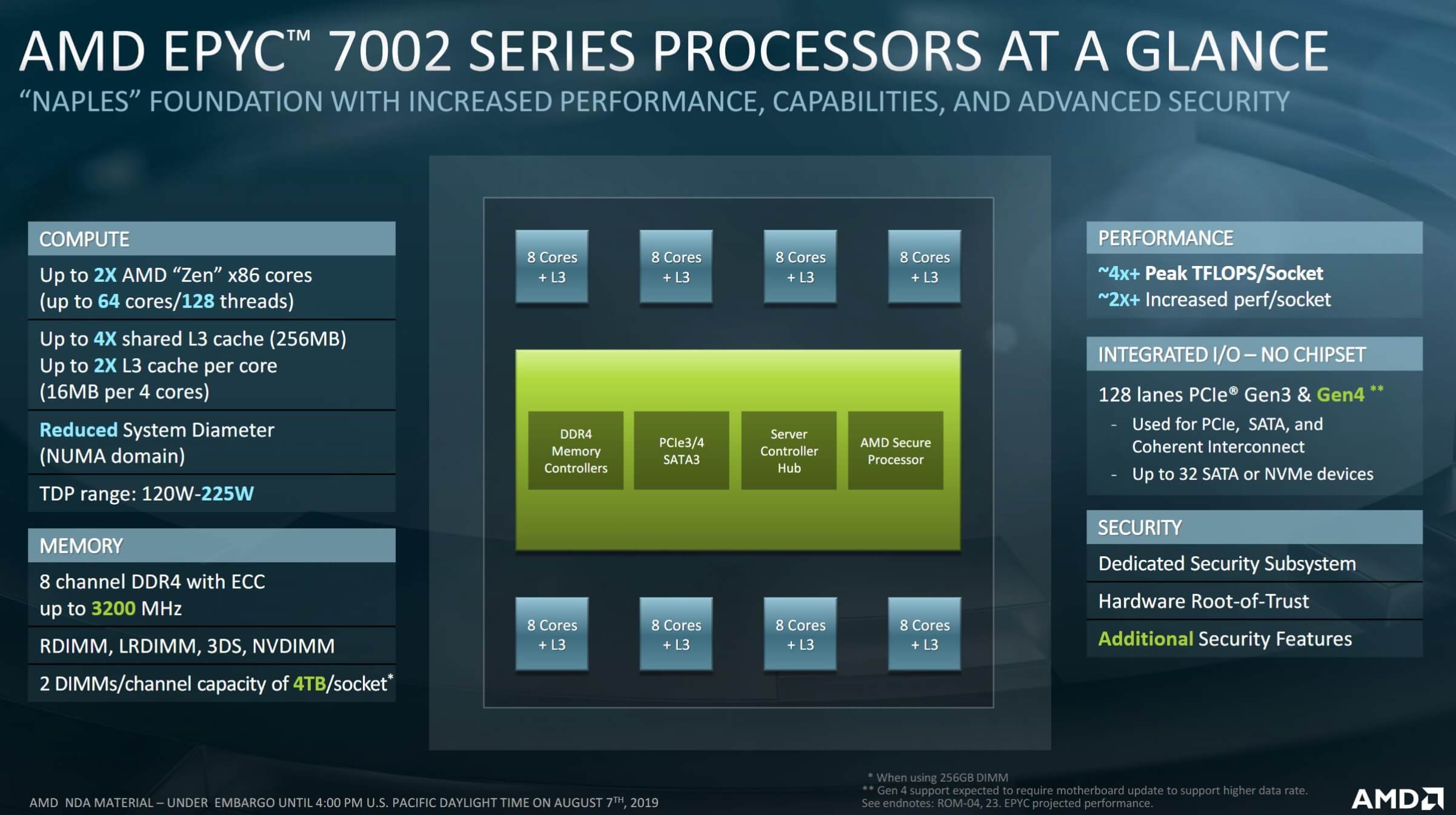 Berdasarkan teknologi AMD Zen 2, chip Epyc 7xx2 memiliki cukup banyak perbedaan, dimana ini dibangun sebagai paket sembilan-die dibandingkan dengan empat die yang ditemukan pada generasi pertama.