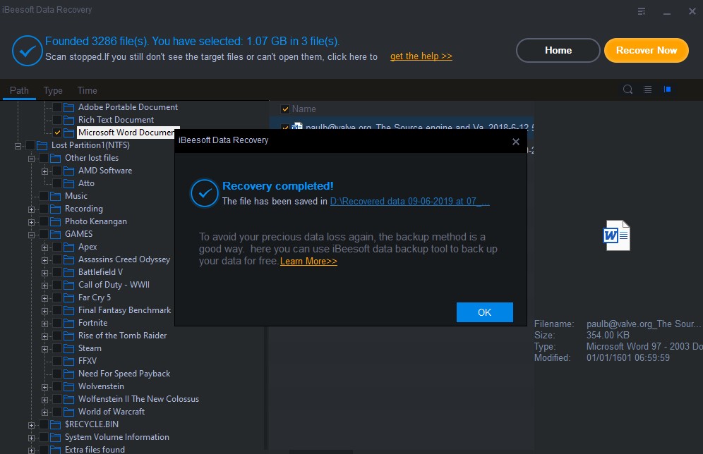 Dan ketika kalian sudah mendapatkan file yang sebelumnya telah hilang, kalian hanya perlu menekan tombol Recover now, dimana proses recovery juga cukup cepat untuk dilakukan (meski itu tergantung juga dari besarnya file) dan bisa disimpan dilokasi yang berbeda.