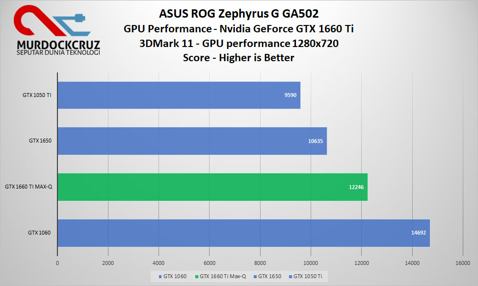 Untuk urusan grafis, Nvidia GeForce GTX 1660 Ti Max-Q menjadi kekuatan utama yang benar-benar sangat layak untuk dipertimbangkan untuk gaming eSport maupun level AAA. Kehadiran VRAM sebesar 6GB GDDR6 192-Bit dan clockspeed up to 1335Mhz bisa membawa arti besar untuk membawa Fps semakin nyaman bagi konsumen, meskipun agak lebih lambat sekitar 15% jika dibandingkan dengan seri sama tanpa fitur Max-Q.