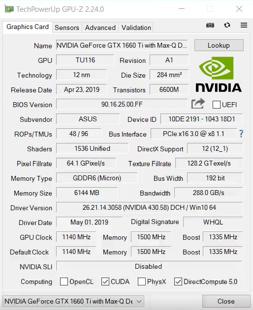 | Graphics | NVIDIA® GeForce® GTX 1660 Ti 6GB GDDR6 |