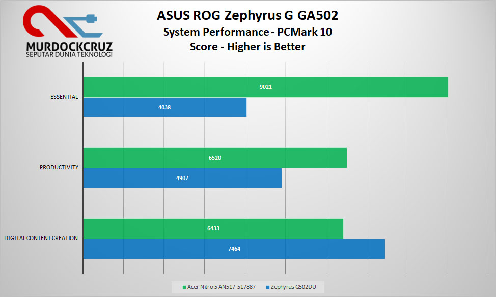 Untuk kinerja sistem, PCMark 10 bisa mewakili seberapa baik laptop gaming ini bagi pengguna, khususnya untuk berbagai aplikasi extra, termasuk pembuatan konten yang cukup menuntut.