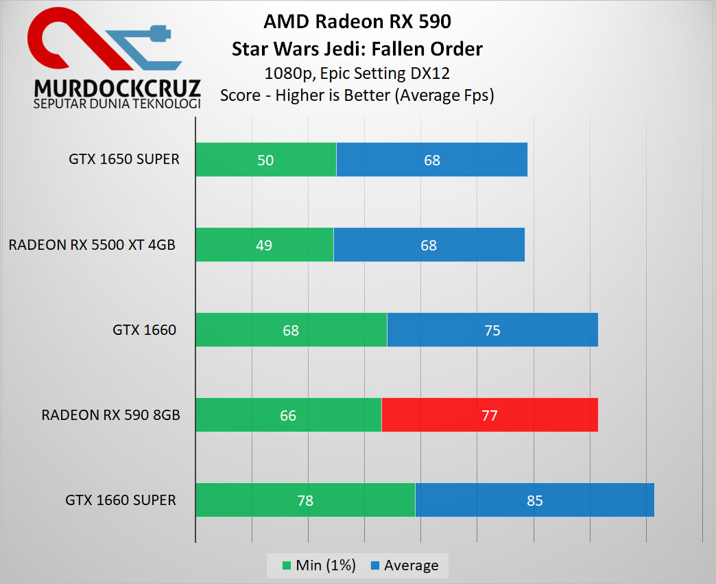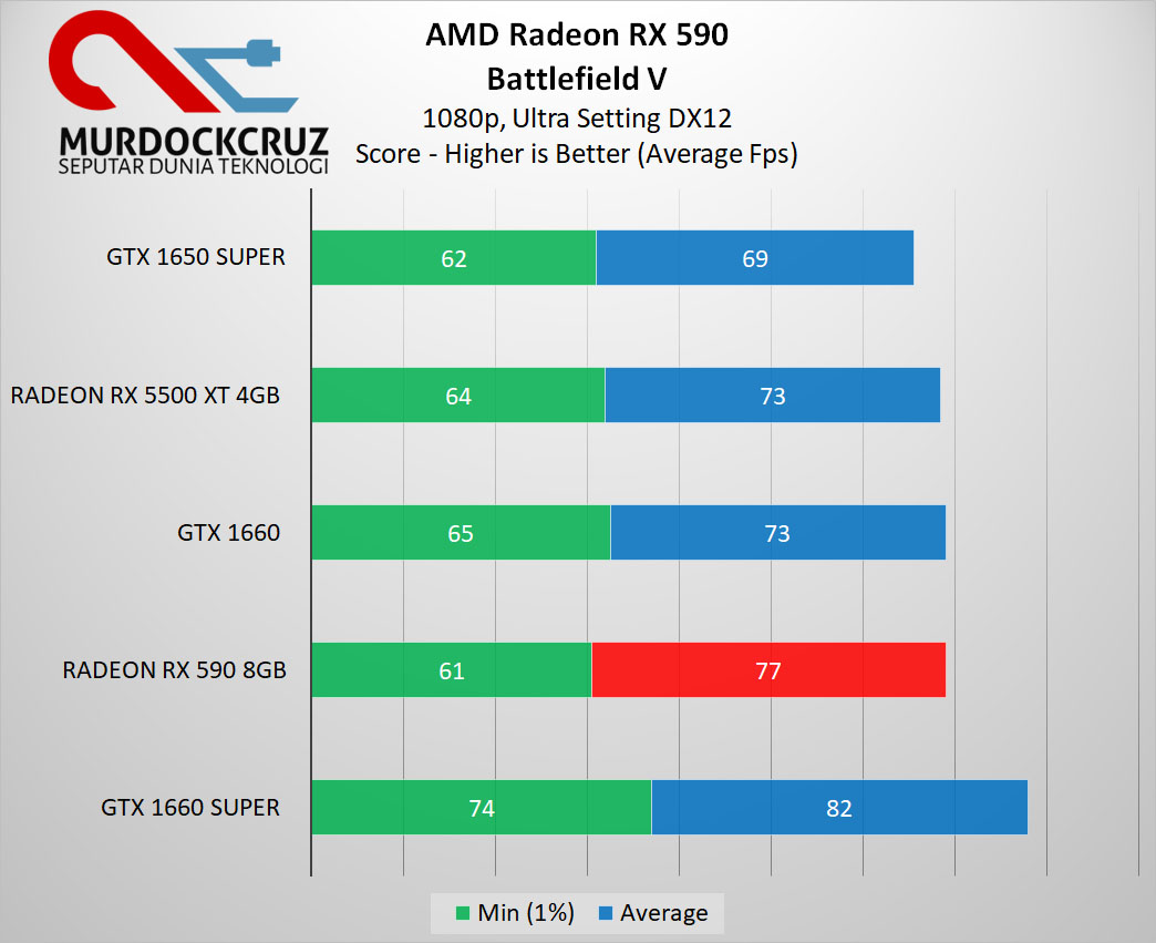 Untungnya, Radeon RX 590 masih memiliki wibawa dan bisa memberikan kinerja dengan Fps rata-rata hingga 77 dengan perbedaan sekitar 5.4% lebih baik dibanding GTX 1660 Super maupun RX 5500 XT versi 4GB.