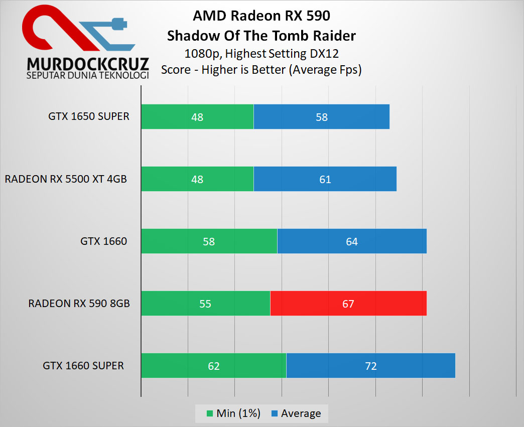 Sedangkan untuk Shadow Of The Tomb Raider, Radeon RX 590 mampu memberikan nilai unggulan pasti dibanding RX 5500 XT maupun GTX 1660 dengan selisih sekitar 4.3%.