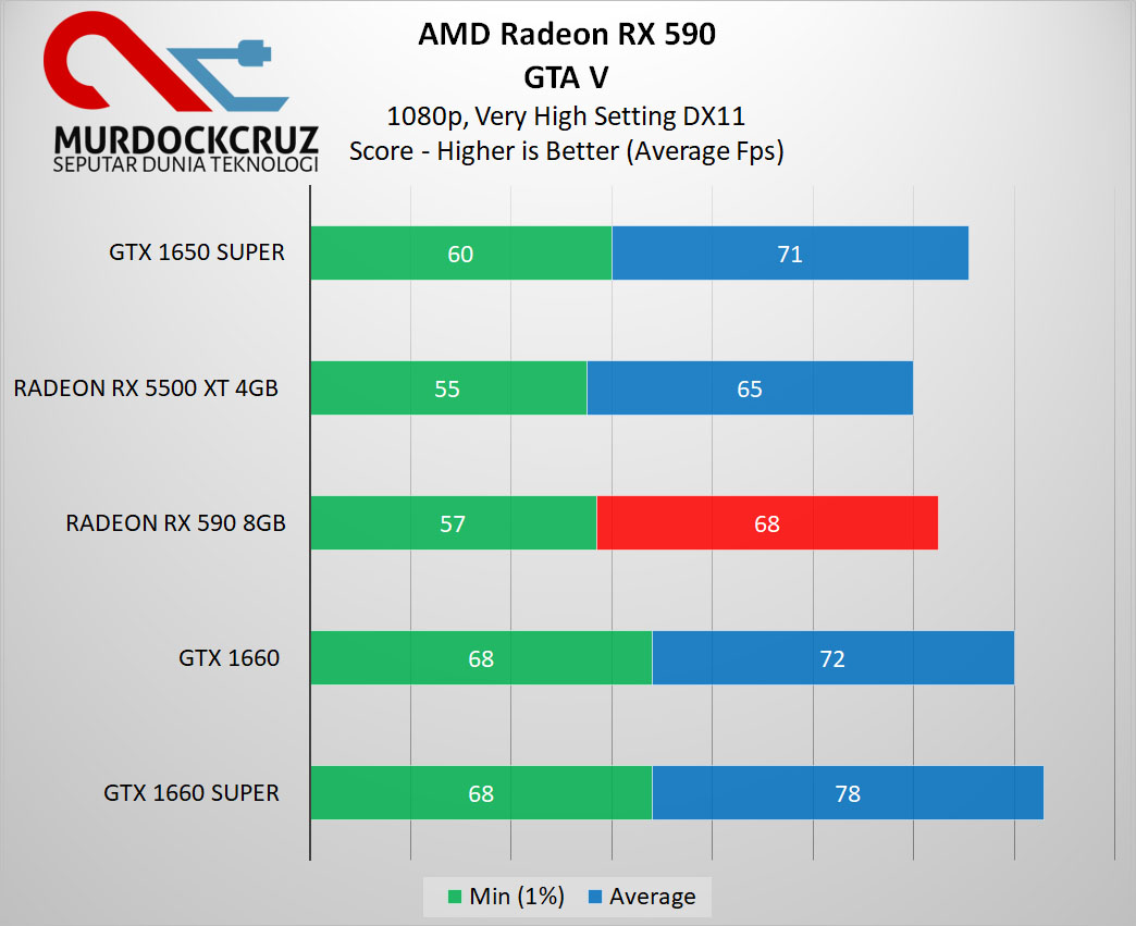 Sayangnya, Radeon RX 590 tidak mampu bersaing ketat pada game lama yang sebenernya masih layak untuk dimainkan hingga hari ini, yaitu GTA V dengan Fps rata-rata 68. Terpaut selisih sekitar 14% dibanding GTX 1660 Super.