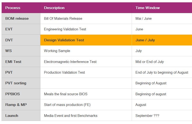 Pada bulan Juli, ada sampel kerja dari produk jadi untuk NVIDIA dan mitra industrinya untuk divalidasi. Ini juga terjadi ketika regulator seperti FCC dan CE melakukan tes EMI. Tes validasi produksi (PVT), atau pemeriksaan jalur produksi, terjadi pada akhir Juli / awal Agustus.