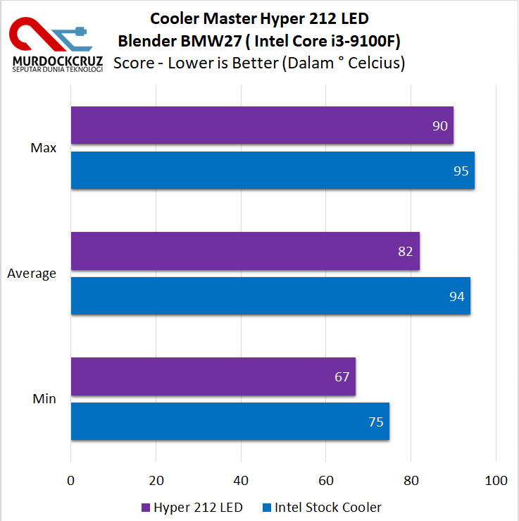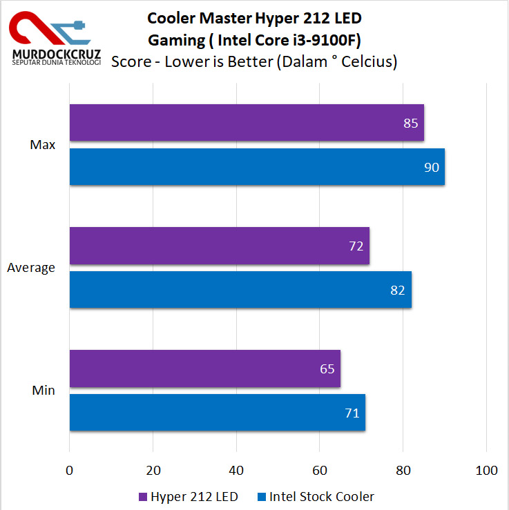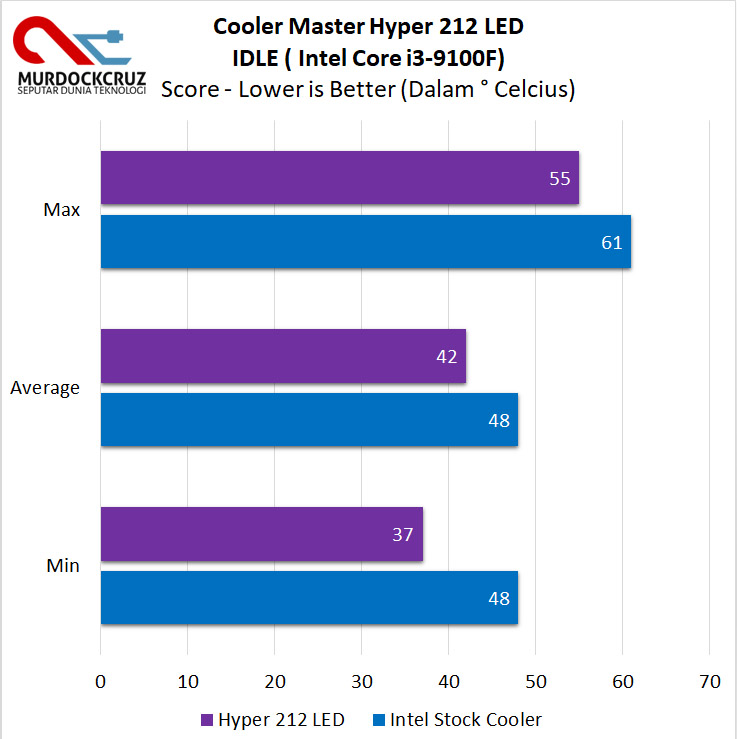 Bagaimana dengan Intel? Stock Cooler Intel pada dasarnya masih solid, namun belum mampu berlaku jauh lebih positif untuk menurunkan suhu secara signifikan, bahkan untuk kasual prosesor sekelas Core i3 9100F sekalipun. Untuk itulah, kami bandingkannya saat ketika memakai Hyper 212 LED, dan lihat bagaimana ini bisa beraksi.