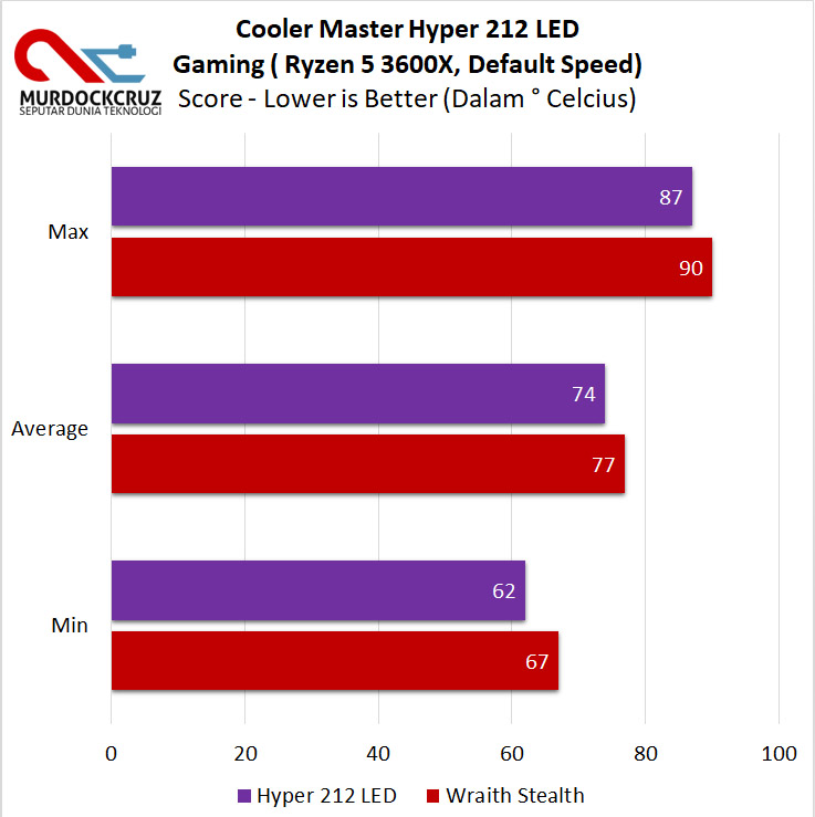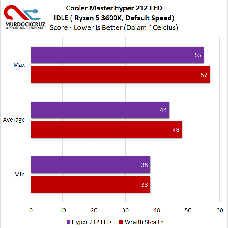 Nah, saat idle, performa yang ditawarkan Hyper 212 LED unggul sekitar 8% dengan suhu rata-rata hingga 44° Celcius dibanding Wraith Stealth yang memiliki rata-rata suhu idle hingga 48° celcius.