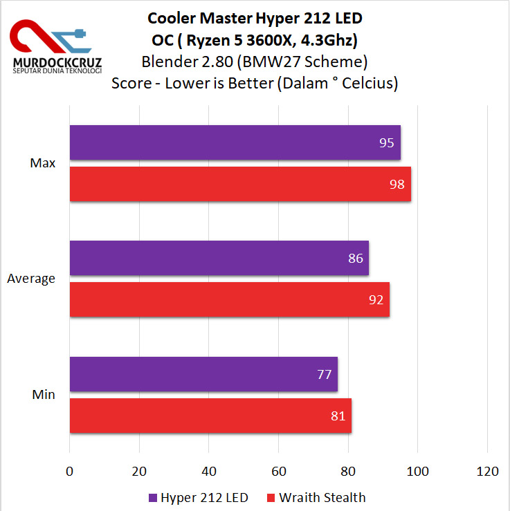 Nah, performa OC juga berlaku untuk melihat perbandingan bagaiman efektifnya Hyper 212 LED jika dibanding stock cooler bawaan default AMD. Nyatanya, saat mengetesnya dengan tes Blender dengan skema BMW27 (all core berjalan) pada kecepatan 4.3 Ghz, Hyper 212 LED bisa cukup baik meredam panasnya suhu yang dihasilkan rata-rata hingga 86° celcius dengan perbedaan sekitar 7% jika dibanding stock cooler dengan suhu rata-rata mencapai 92° Celcius. Meskipun tidak memberikan tingkat perbedaan terlalu jauh, namun penurunan suhu bisa dibilang positif, meskipun saat bekerja tinggi, fan sedikit agak berisik.