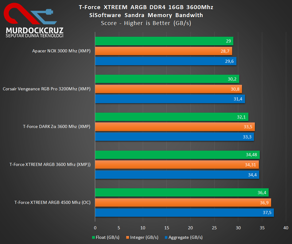 Hal yang sama juga berlaku untuk SiSoftware Sandra yang bisa menunjukan seberapa efektif perangkat memori bagi pengguna, khususnya dalam scenario Memory Bandwith. XTREEM ARGB pada speed 3600 Mhz cukup positif dengan skor rata-rata hingga 34Gb/s, dan OC hingga 37.5 GB/.