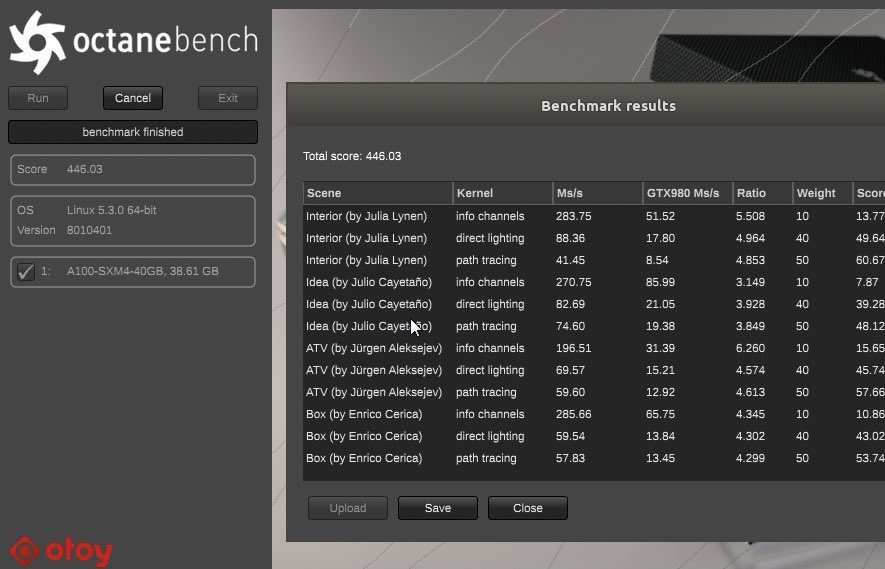 Nvidia Titan V sebelumnya memegang rekor dengan skor rata-rata 401 poin. Kini, A100 menghasilkan kinerja hingga 11,2% lebih tinggi daripada Titan V, itupun saat A100 dijalankan dengan RTX dinonaktifkan. Hasilnya, A100 mencetak 446 poin pada OctaneBench, sehingga bisa mengklaim gelar GPU tercepat yang pernah menghiasi benchmark.