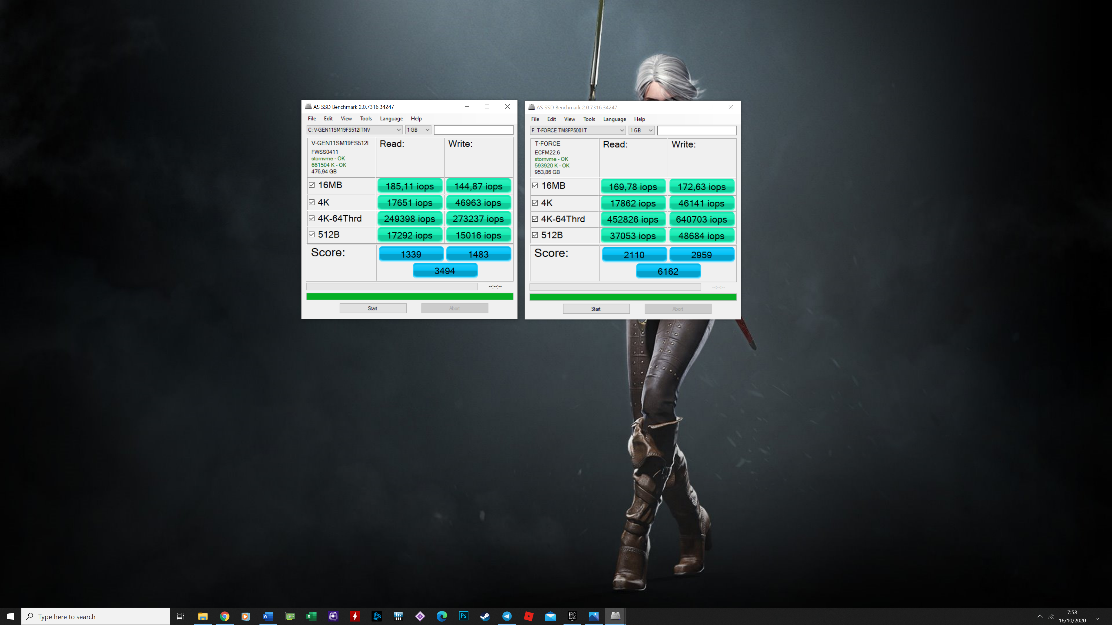 Pertama kami mengetesnya melalui software tolak ukur populer AS SSD benchmark pada beberapa skenario. Pada skenario read/write speed sequential, read speed mungkin bukanlah yang terbaik jika dibanding beberapa SSD yang udah kita coba, cuman untuk write speed, SSD ini menawarkan kinerja paling solid, bahkan jauh lebih baik dengan writes speed rata-rata hingga 2.7 GB/s.