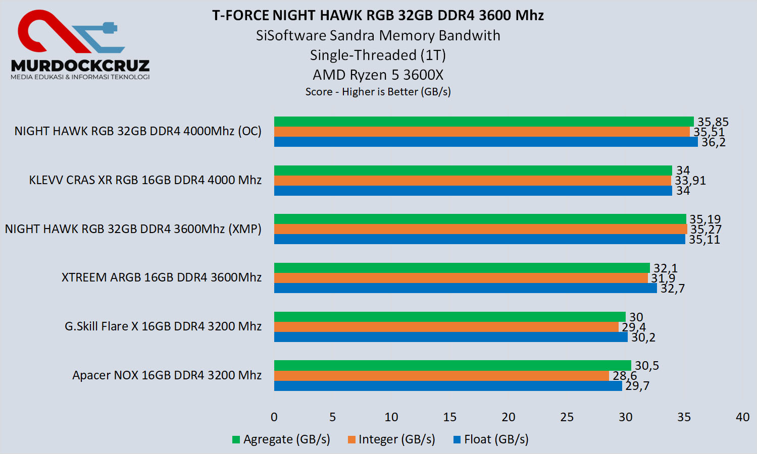 Sedangkan pada tes SiSoftware Sandra Memory bandwith dengan skenario singe-threads, Night Hawk RGB memimpin dengan skor yang cukup besar, bahkan melalui fitur XMP default tanpa OC sekalipun dengan skor hingga 35 GB/s.