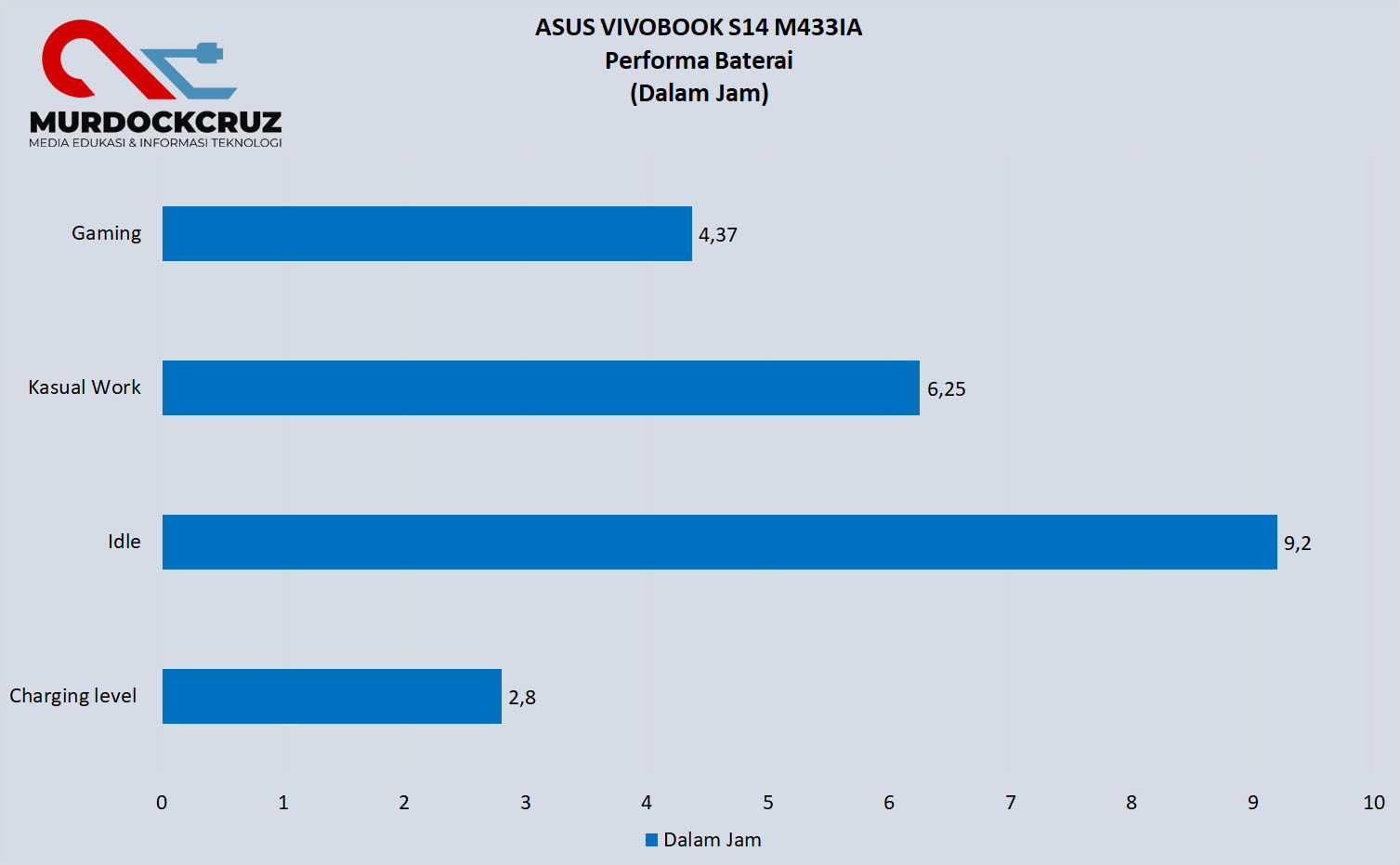 Gaming atau pemakaian yang lebih intensif bisa jauh lebih singkat hingga 4 jam 37 menit. Sesuatu yang agak kurang menurut kami untuk laptop sekelas VivoBook, dimana kami harap sih bisa berlaku jauh lebih panjang.