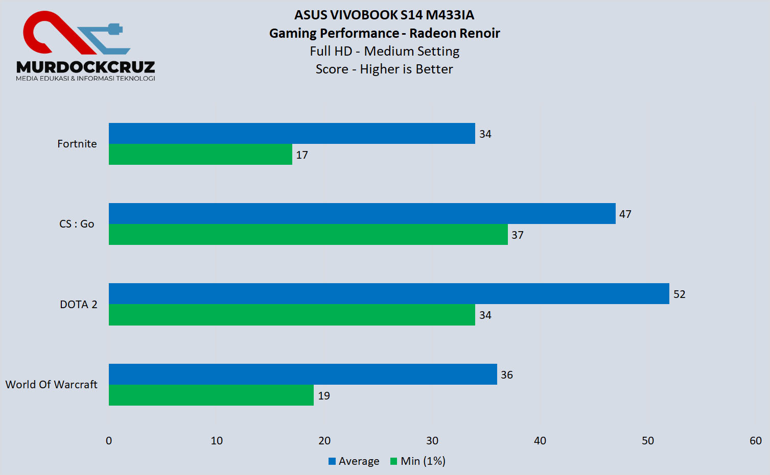 Selain CPU, nilai unggulan laptop ini juga hadir dalam grafis integrated Renoir GPU bawaan prosesor. Kalian bahkan bisa main game eSport pada resolusi Full-HD dengan fps yang cukup nyaman tanpa banyak kendala. Contoh, World Of Warcraft BFA masih bisa kok dimainin di resolusi Full HD pada pengaturan medium. Dan itu juga berlaku buat game lain sekelas DOTA2 atau CS : GO.