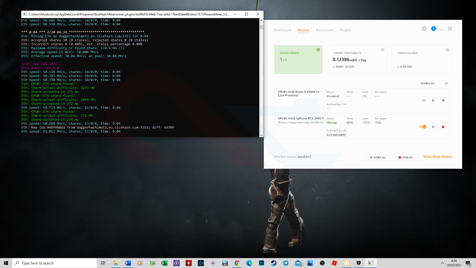 Dengan tools mining dari Nicehash, dimana kalian juga bisa memakai alat ini untuk memulai proses mining, kinerja RTX 3060 Ti juga sangat baik, apalagi jika melihat harga Bitcoin hari ini. Secara utuh, VGA tersebut bisa menghasilkan speed efektif rata-rata 50 MH/s dan konsumsi daya yang sebenernya enggak terlalu besar hingga 183 Watt.