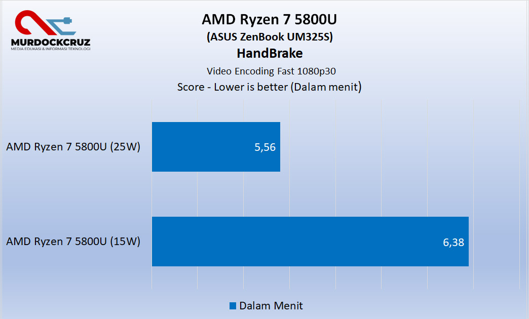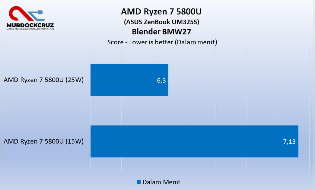 Rendering image pake software Blender juga bisa jadi penunjuk kalo pembuatan konten itu butuh kinerja CPU yang solid. Dan Ryzen 7 5800U cuma butuh waktu 6 menit 33 detik ketika daya 25W berlaku. Kalo 15W sedikit lebih lama nyampe 7 menit 13 detik.