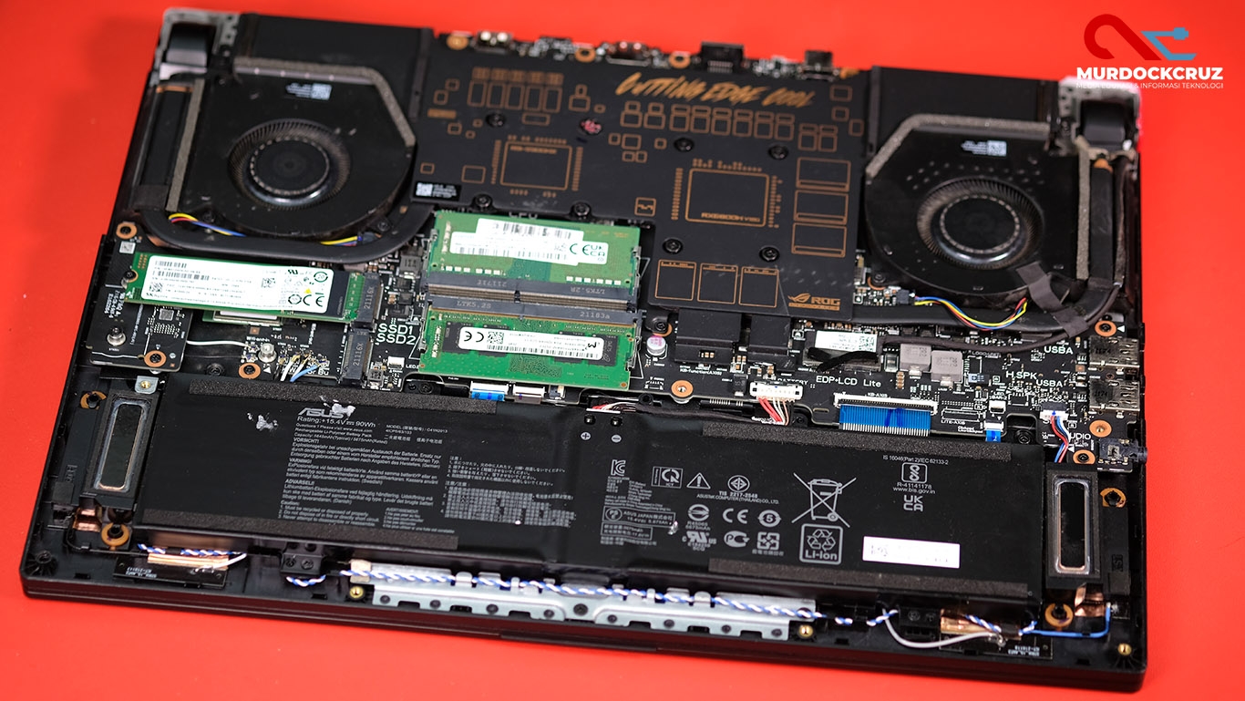 Cuma buat upgrade, ada dua slot RAM yang tersedia, defaultnya udah terisi semua. Jadi ketika pengen opsi yang lebih besar, RAM lama perlu dijual dulu kayaknya. Kalo SSD, ada dua slot M.2 yang siap dukung NVMe SSD paling kenceng, satu udah terisi SSD bawaan. Jadi ketika masih belum cukup, kalian bisa nambah SSD lagi. Soalnya kapasitas 512Gb kayaknya masih kurang tuh, sayang juga sih.